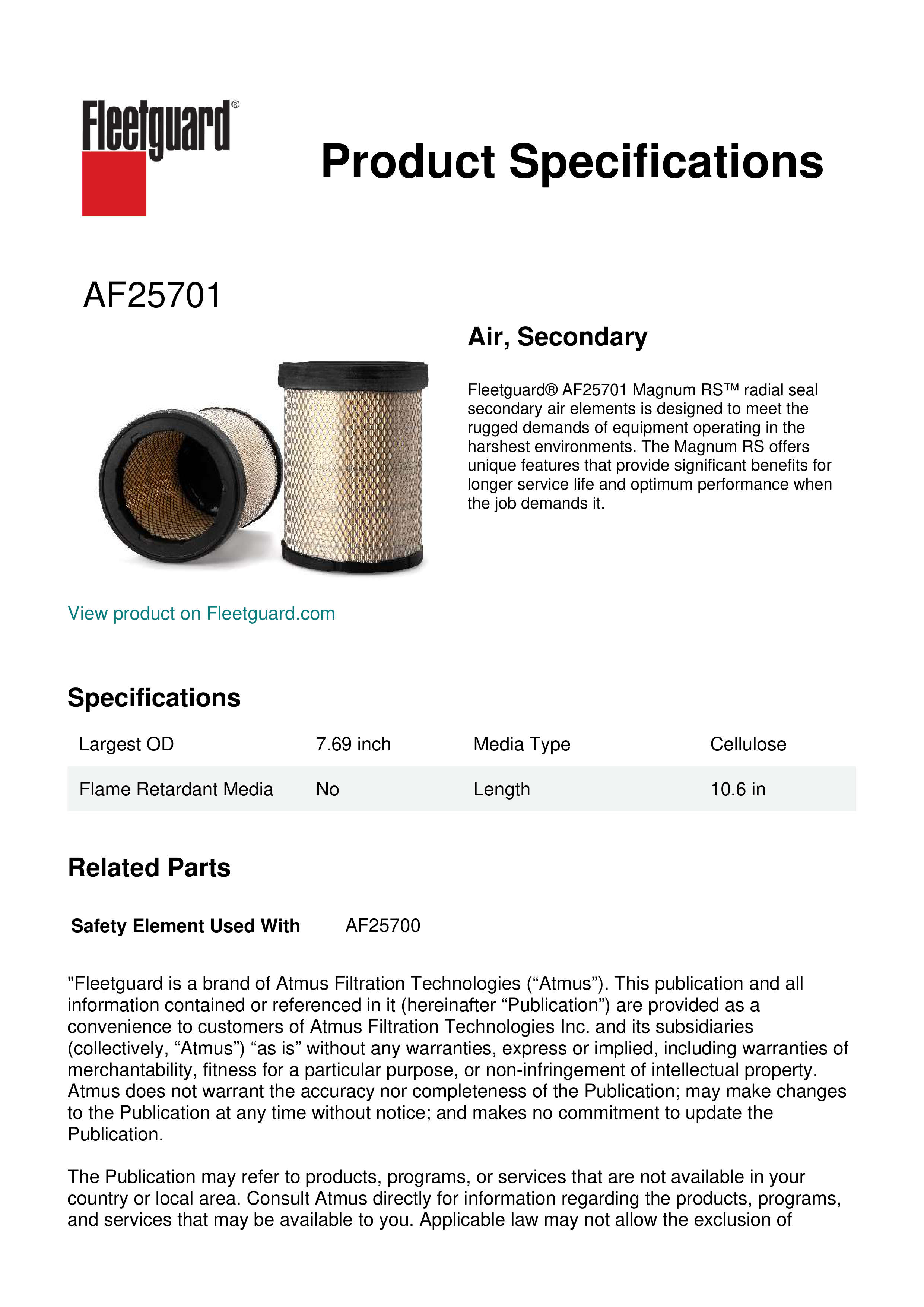 Fleetguard® AF25701 Magnum RS™ radial seal secondary air elements is designed to meet the rugged demands of equipment operating in the harshest environments. The Magnum RS offers unique features that provide significant benefits for longer service life and optimum performance when the job demands it.Specification
