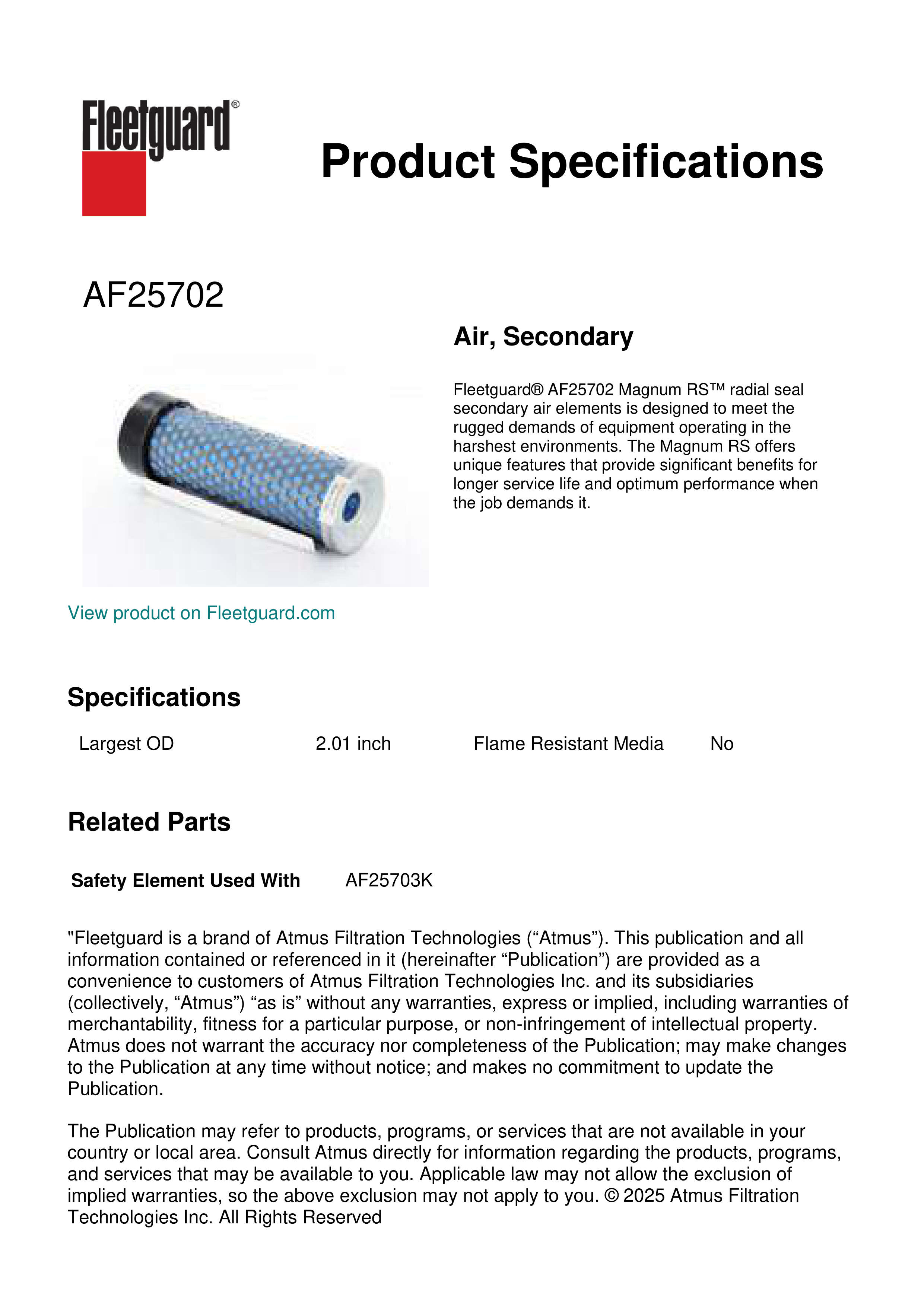 Fleetguard® AF25702 Magnum RS™ radial seal secondary air elements is designed to meet the rugged demands of equipment operating in the harshest environments. The Magnum RS offers unique features that provide significant benefits for longer service life and optimum performance when the job demands it.Specification