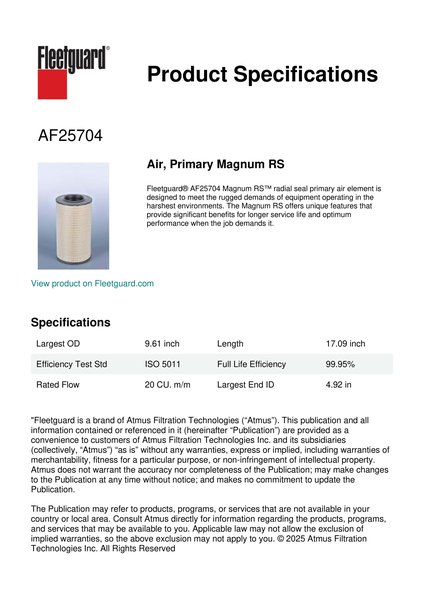 Fleetguard® AF25704 Magnum RS™ radial seal primary air element is designed to meet the rugged demands of equipment operating in the harshest environments. The Magnum RS offers unique features that provide significant benefits for longer service life and optimum performance when the job demands it.Specification