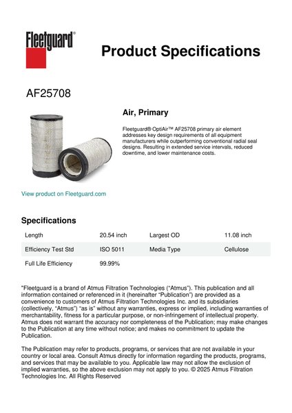 Fleetguard® OptiAir™ AF25708 primary air element addresses key design requirements of all equipment manufacturers while outperforming conventional radial seal designs. Resulting in extended service intervals, reduced downtime, and lower maintenance costs.Specification