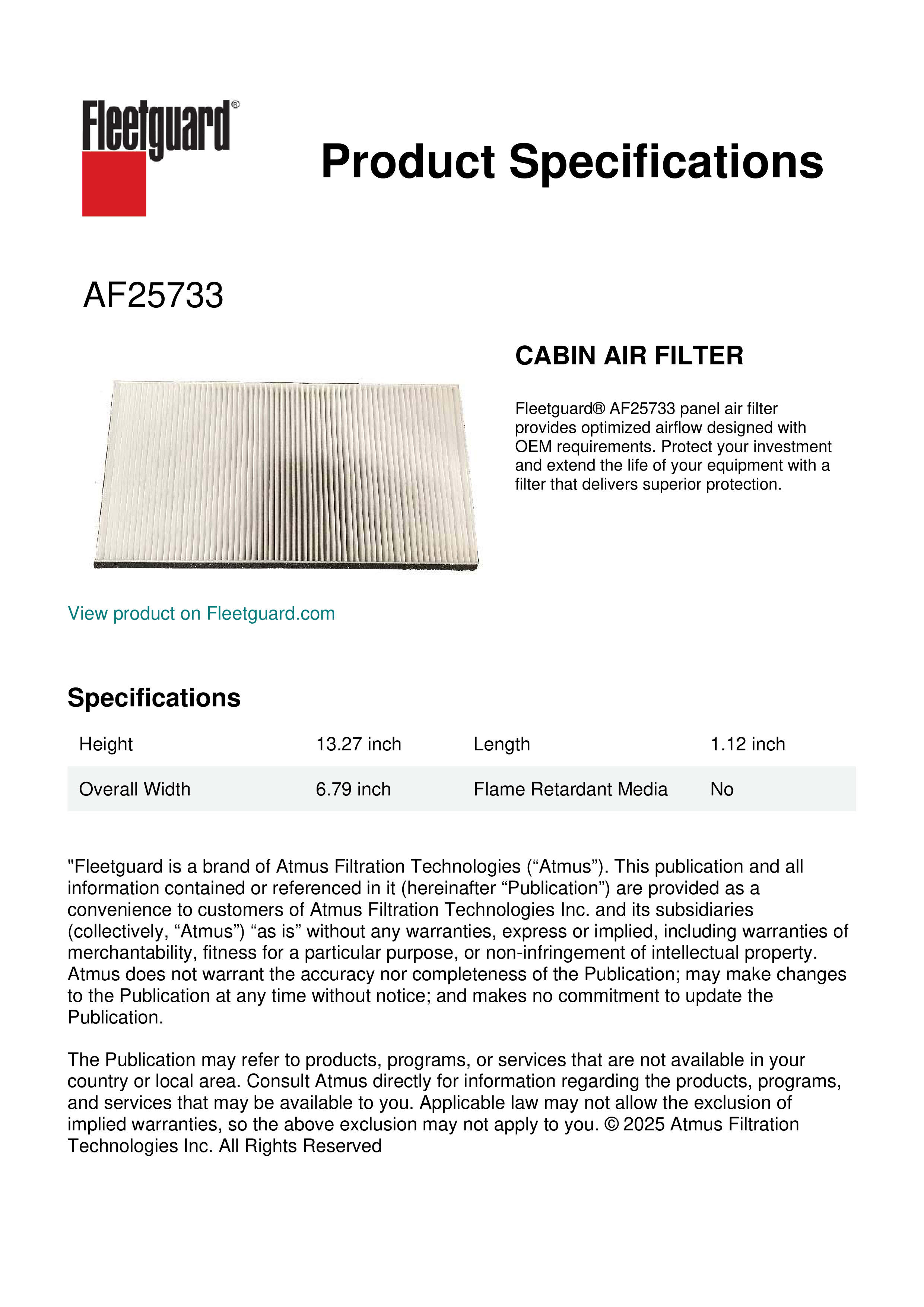 Fleetguard® AF25733 panel air filter provides optimized airflow designed with OEM requirements. Protect your investment and extend the life of your equipment with a filter that delivers superior protection.Specification