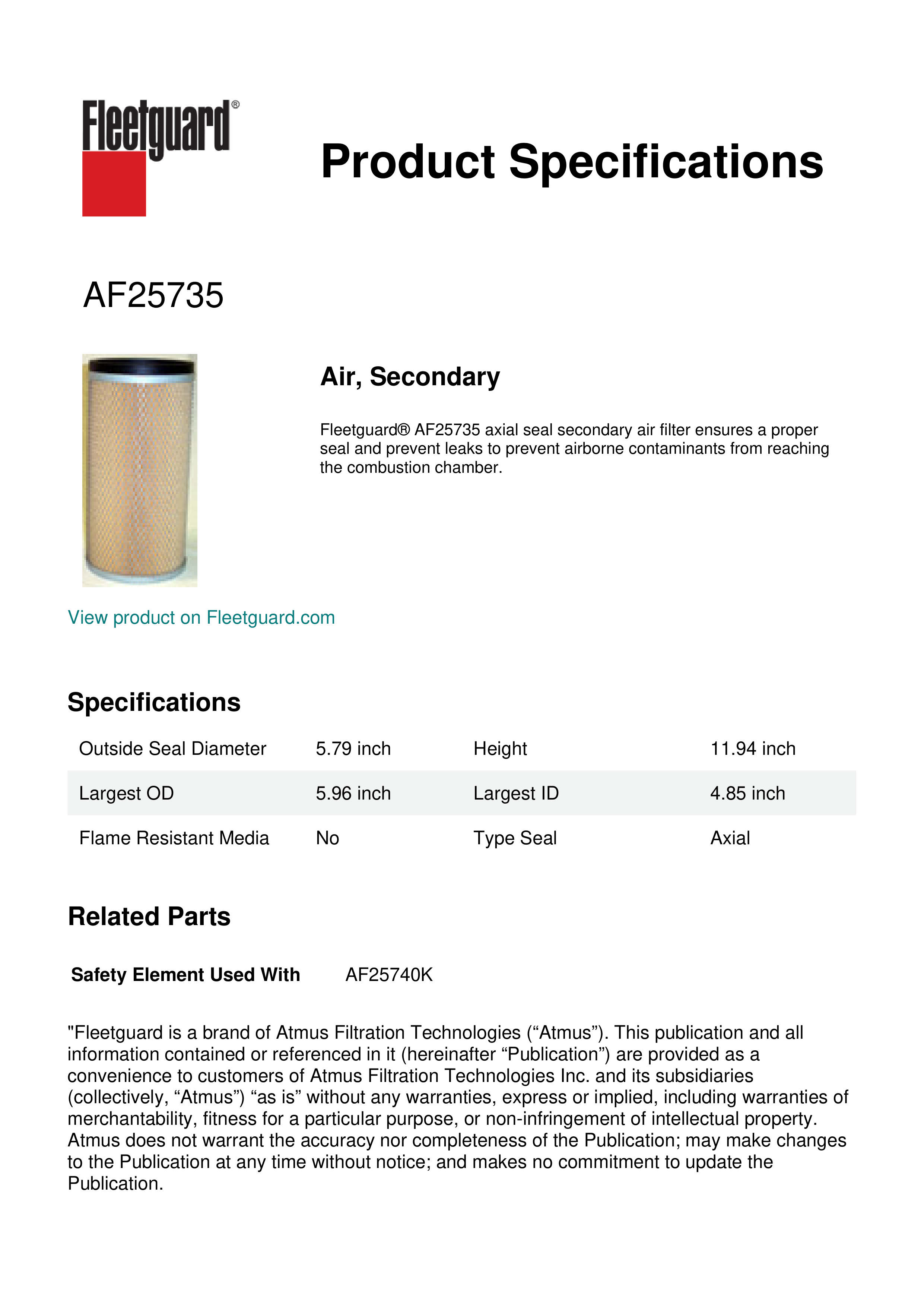 Fleetguard® AF25735 axial seal secondary air filter ensures a proper seal and prevent leaks to prevent airborne contaminants from reaching the combustion chamber.