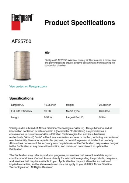 Fleetguard® AF25750 axial seal primary air filter ensures a proper seal and prevent leaks to prevent airborne contaminants from reaching the combustion chamber.