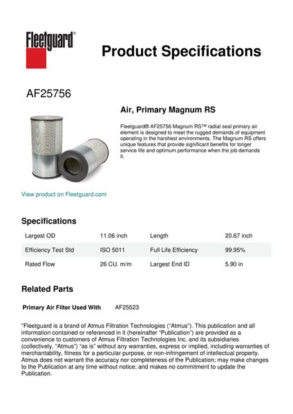 Fleetguard® AF25756 Magnum RS™ radial seal primary air element is designed to meet the rugged demands of equipment operating in the harshest environments. The Magnum RS offers unique features that provide significant benefits for longer service life and optimum performance when the job demands it.Specification