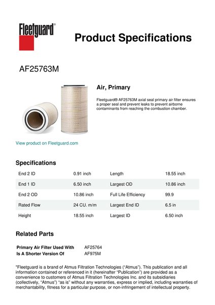 Fleetguard® AF25763M axial seal primary air filter ensures a proper seal and prevent leaks to prevent airborne contaminants from reaching the combustion chamber.