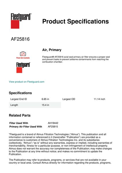 Fleetguard® AF25816 axial seal primary air filter ensures a proper seal and prevent leaks to prevent airborne contaminants from reaching the combustion chamber.