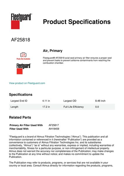 Fleetguard® AF25818 axial seal primary air filter ensures a proper seal and prevent leaks to prevent airborne contaminants from reaching the combustion chamber.