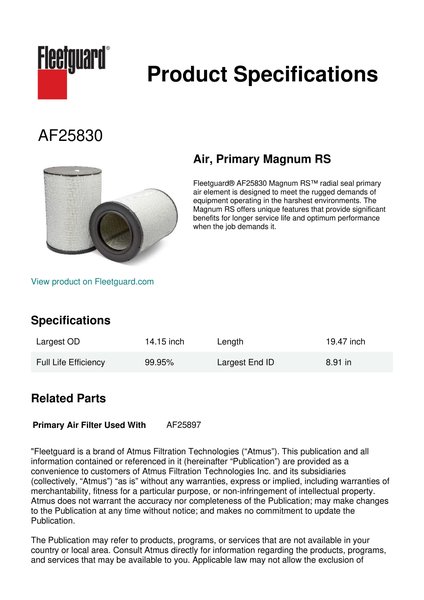Fleetguard® AF25830 Magnum RS™ radial seal primary air element is designed to meet the rugged demands of equipment operating in the harshest environments. The Magnum RS offers unique features that provide significant benefits for longer service life and optimum performance when the job demands it.Specification