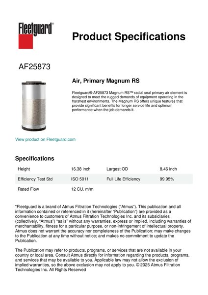 Fleetguard® AF25873 Magnum RS™ radial seal primary air element is designed to meet the rugged demands of equipment operating in the harshest environments. The Magnum RS offers unique features that provide significant benefits for longer service life and optimum performance when the job demands it.