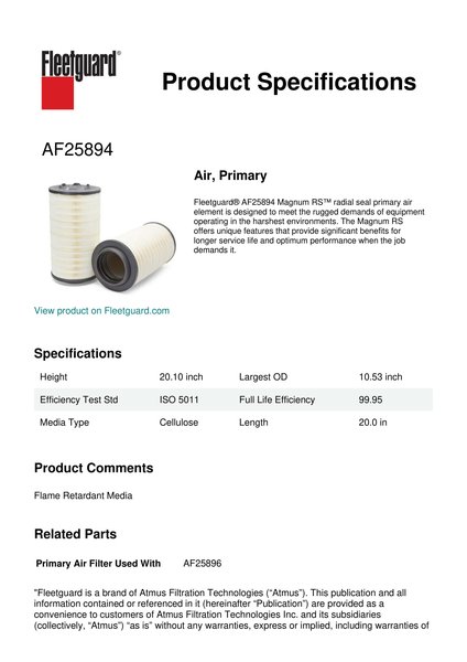 Fleetguard® AF25894 Magnum RS™ radial seal primary air element is designed to meet the rugged demands of equipment operating in the harshest environments. The Magnum RS offers unique features that provide significant benefits for longer service life and optimum performance when the job demands it.Specification