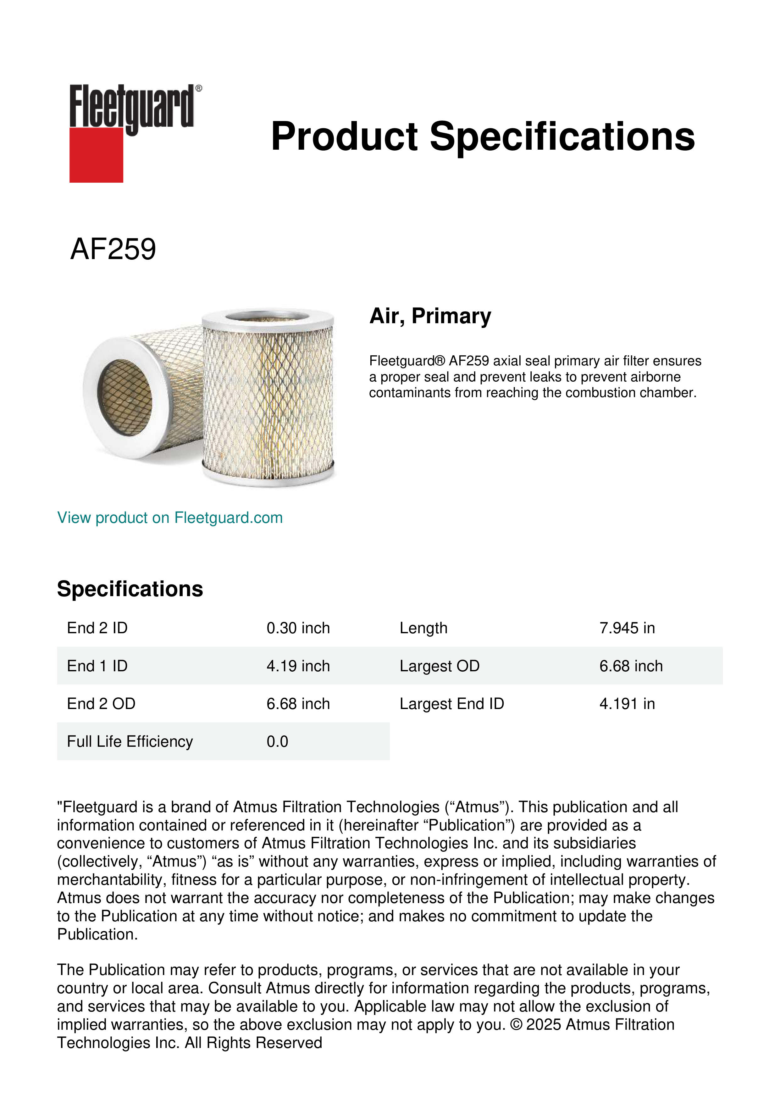 Fleetguard® AF259 axial seal primary air filter ensures a proper seal and prevent leaks to prevent airborne contaminants from reaching the combustion chamber.
