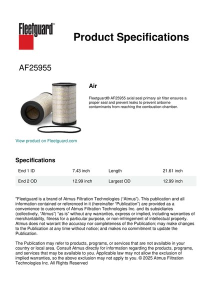 Fleetguard® AF25955 axial seal primary air filter ensures a proper seal and prevent leaks to prevent airborne contaminants from reaching the combustion chamber.