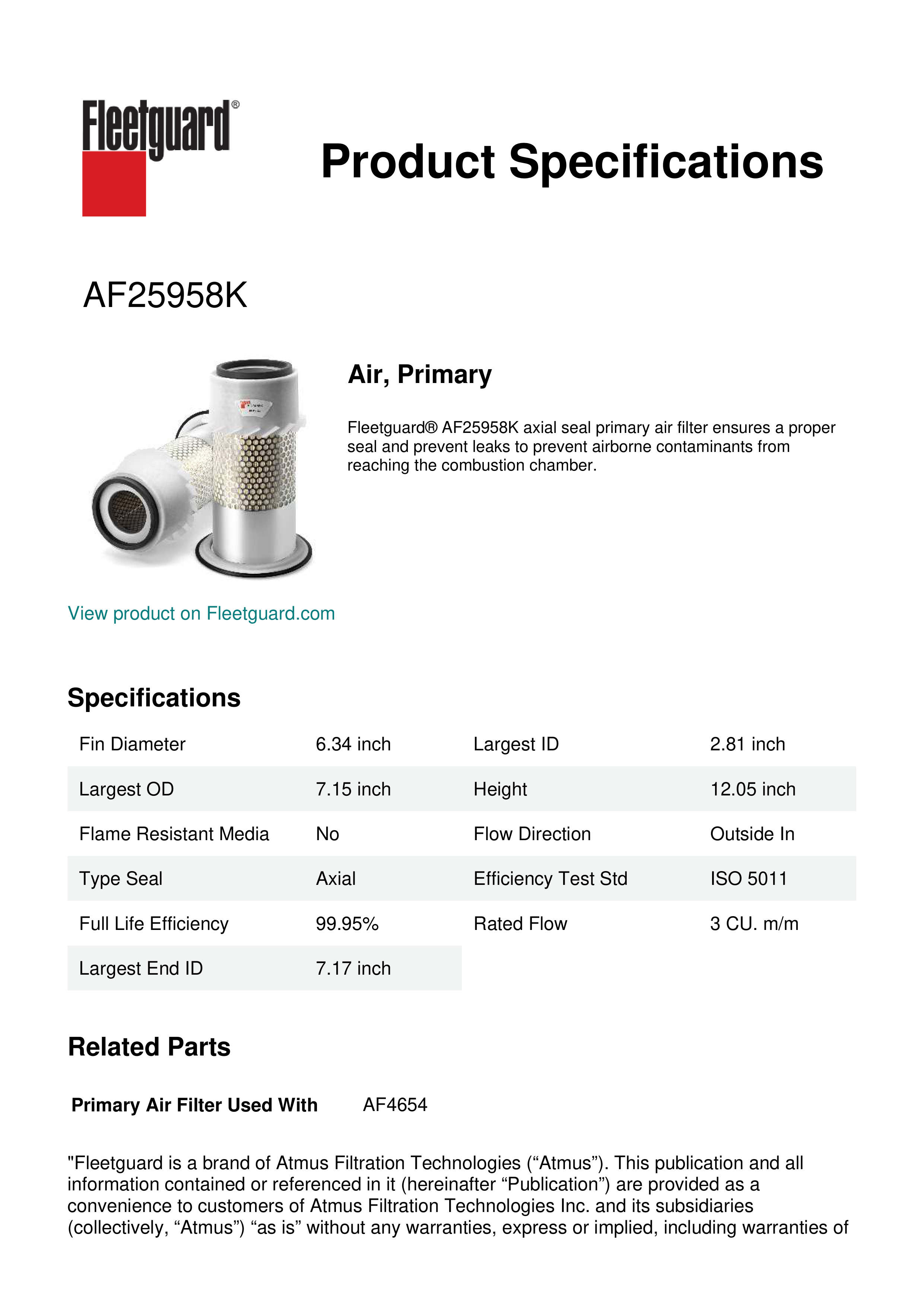 Fleetguard® AF25958K axial seal primary air filter ensures a proper seal and prevent leaks to prevent airborne contaminants from reaching the combustion chamber.Specification