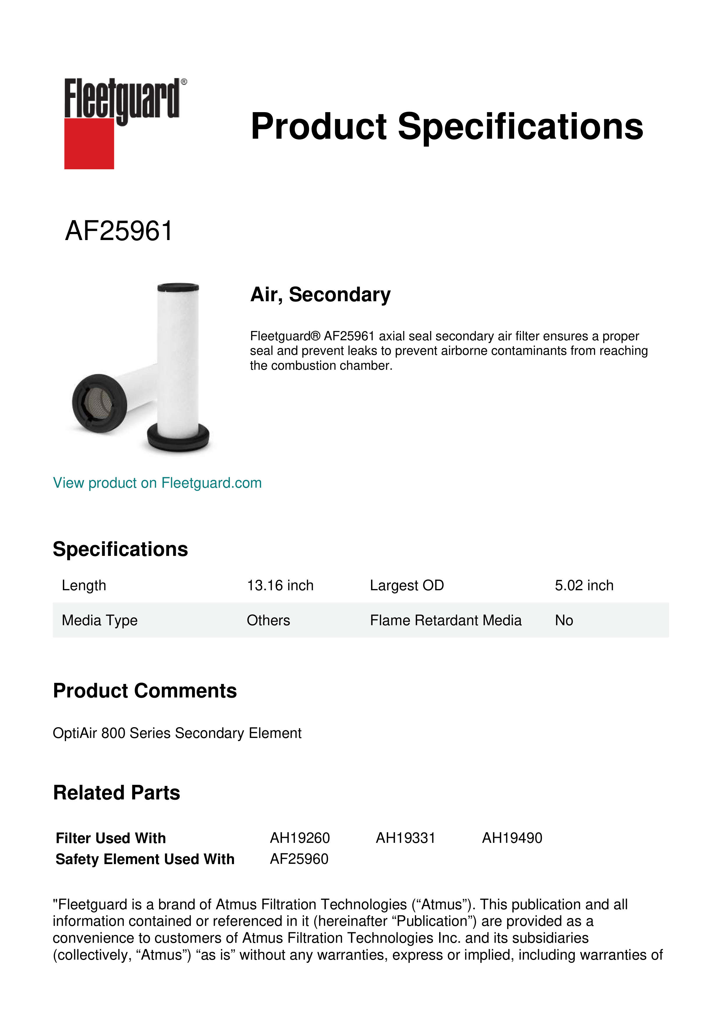Fleetguard® AF25961 axial seal secondary air filter ensures a proper seal and prevent leaks to prevent airborne contaminants from reaching the combustion chamber.