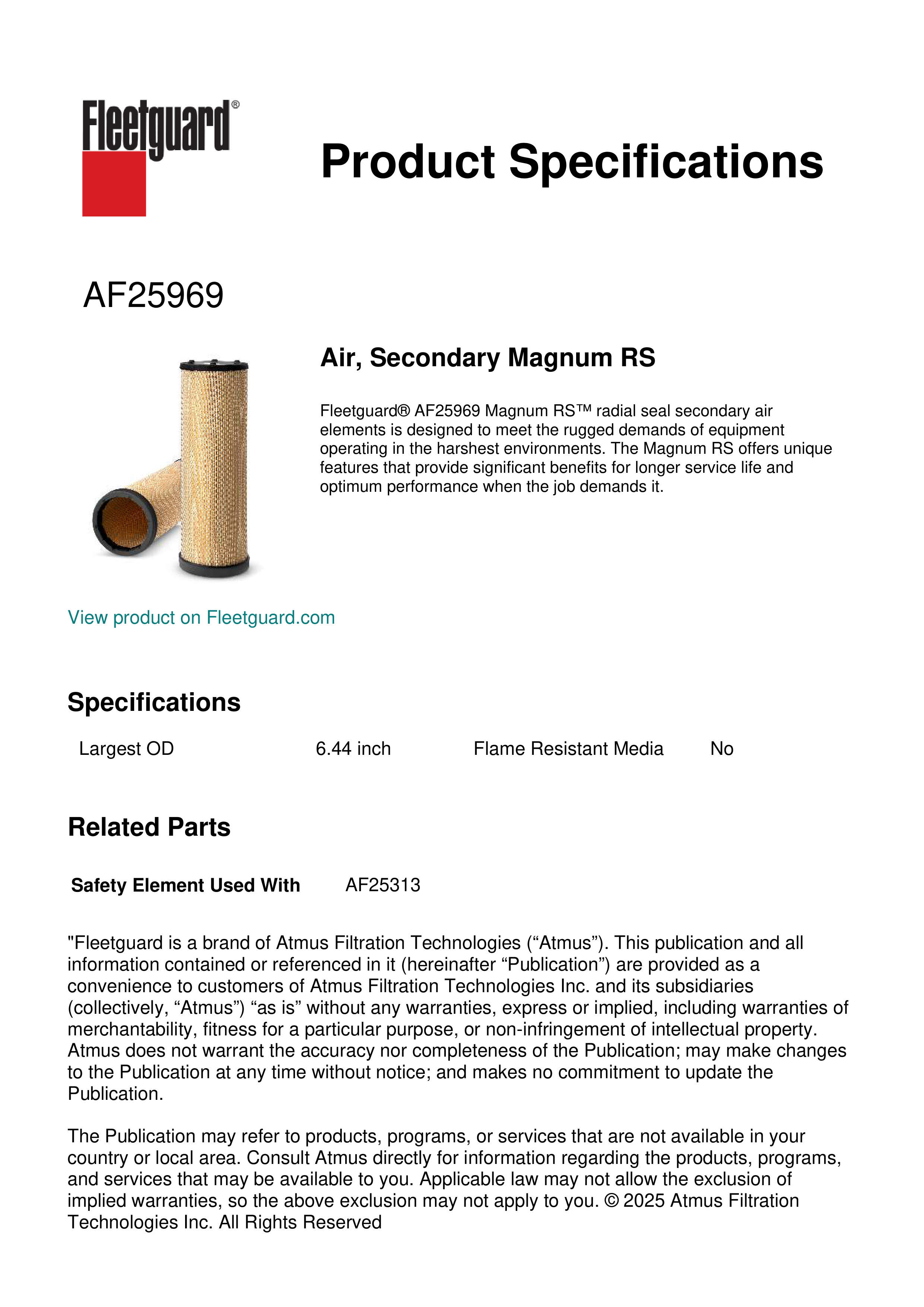 Fleetguard® AF25969 Magnum RS™ radial seal secondary air elements is designed to meet the rugged demands of equipment operating in the harshest environments. The Magnum RS offers unique features that provide significant benefits for longer service life and optimum performance when the job demands it.Specification
