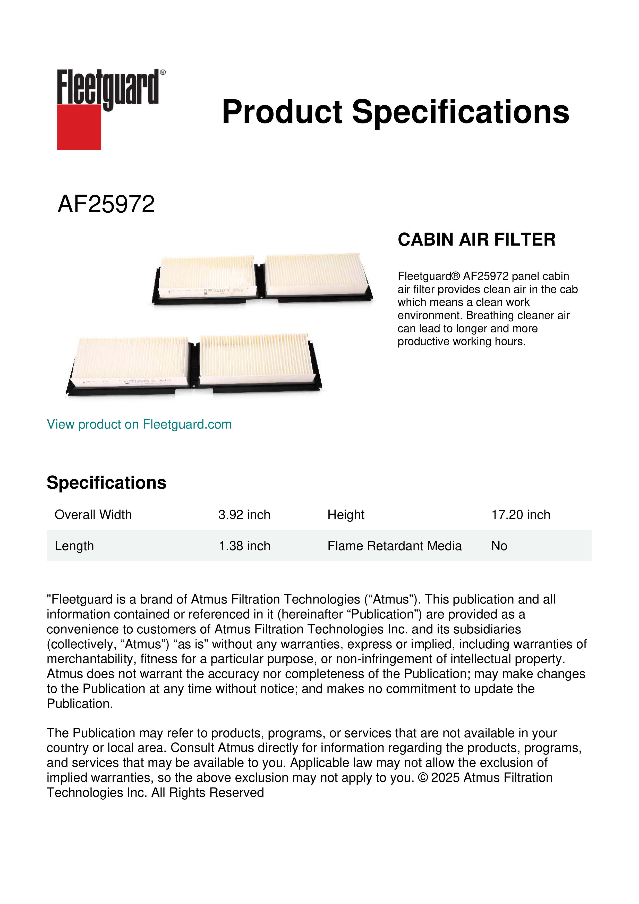 Fleetguard® AF25972 panel cabin air filter provides clean air in the cab which means a clean work environment. Breathing cleaner air can lead to longer and more productive working hours.Specification