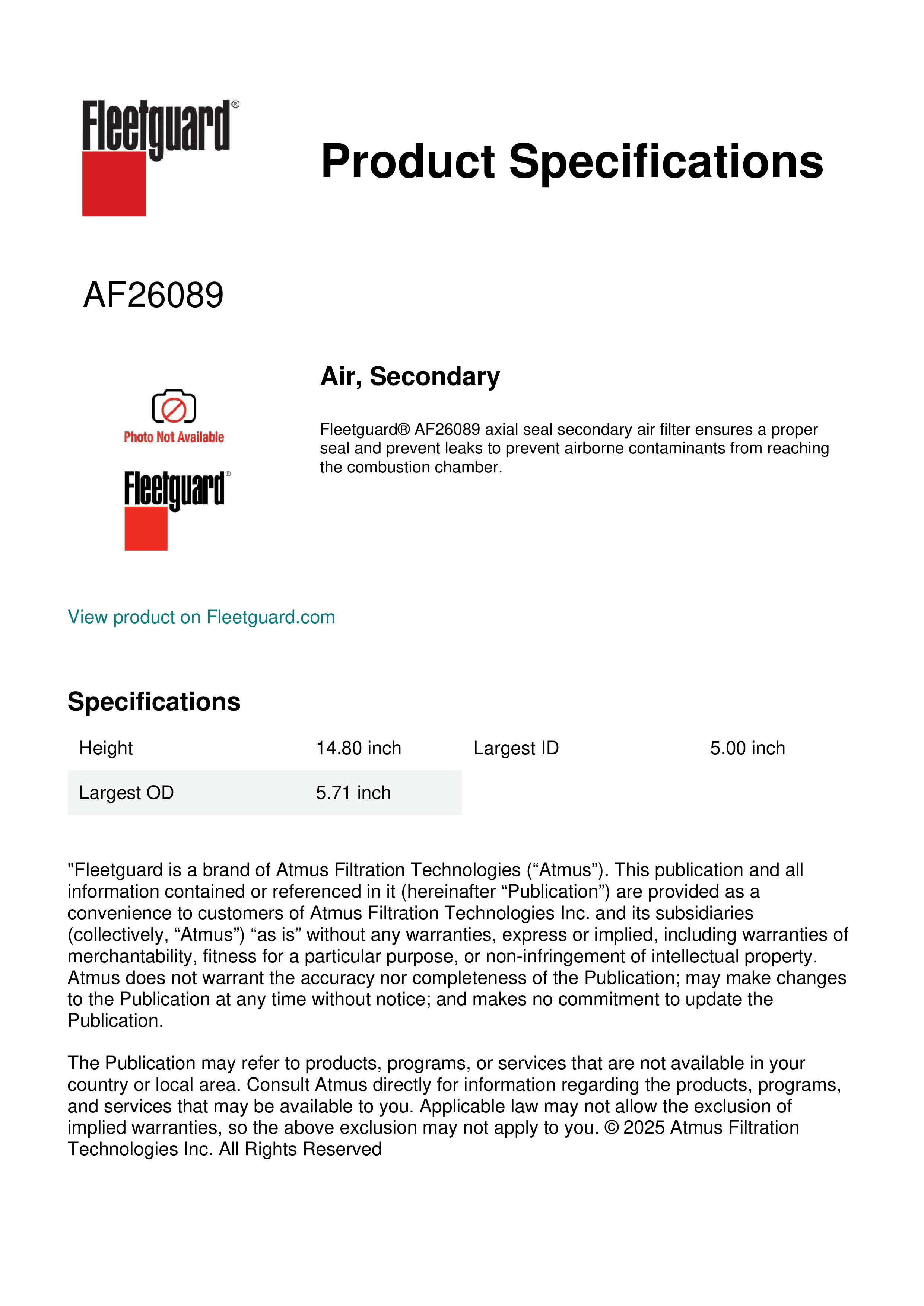 Fleetguard AF26089 Air, Secondary