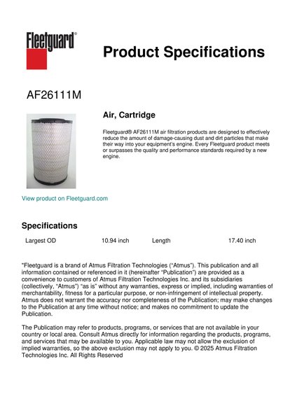 Fleetguard® AF26111M air filtration products are designed to effectively reduce the amount of damage-causing dust and dirt particles that make their way into your equipment’s engine. Every Fleetguard product meets or surpasses the quality and performance standards required by a new engine.Specification