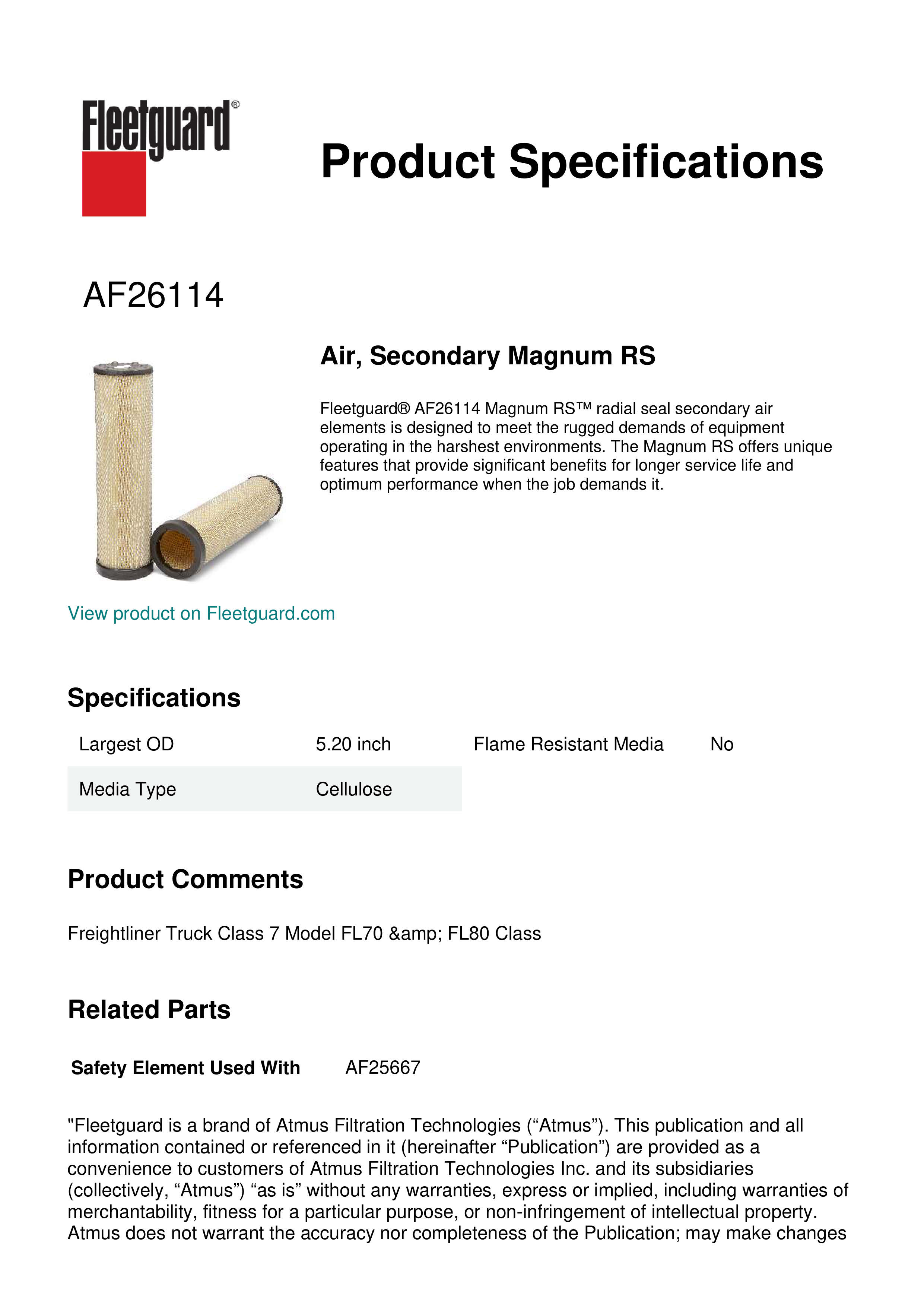 Fleetguard® AF26114 Magnum RS™ radial seal secondary air elements is designed to meet the rugged demands of equipment operating in the harshest environments. The Magnum RS offers unique features that provide significant benefits for longer service life and optimum performance when the job demands it.Specification