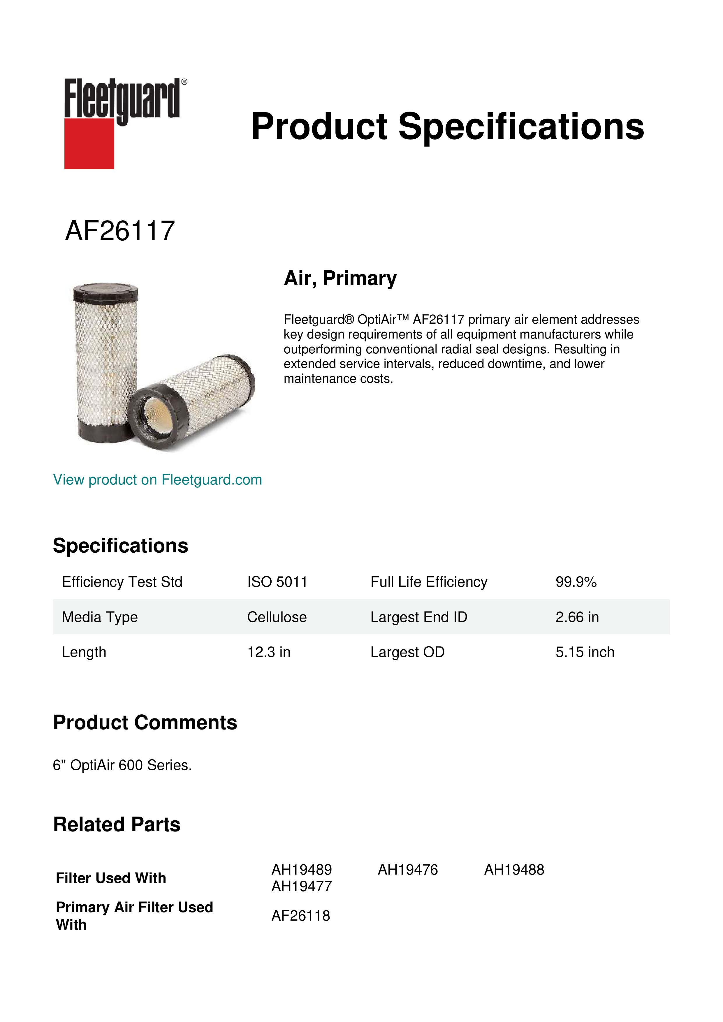Fleetguard® OptiAir™ AF26117 primary air element addresses key design requirements of all equipment manufacturers while outperforming conventional radial seal designs. Resulting in extended service intervals, reduced downtime, and lower maintenance costs.Specification