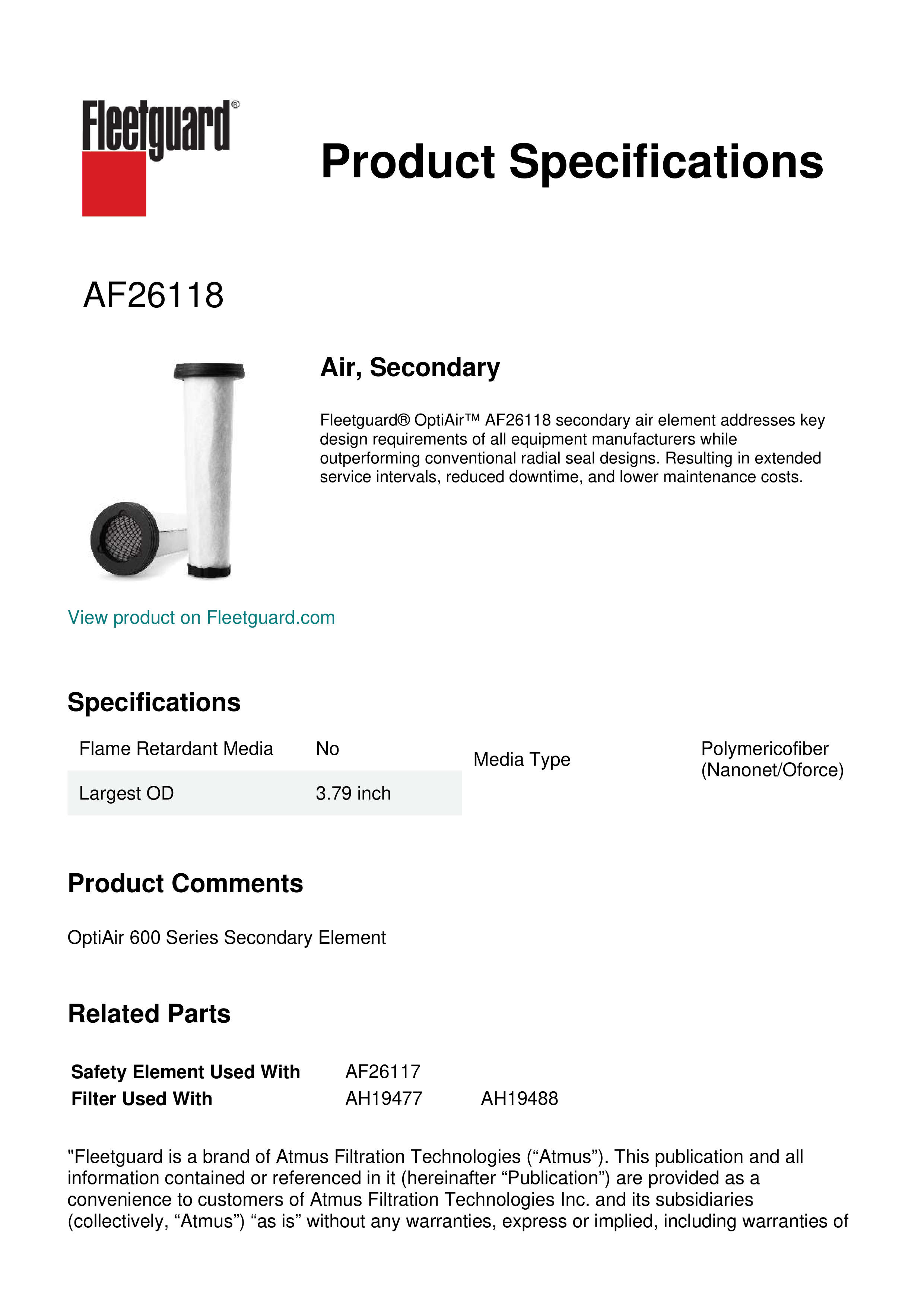 Fleetguard® OptiAir™ AF26118 secondary air element addresses key design requirements of all equipment manufacturers while outperforming conventional radial seal designs. Resulting in extended service intervals, reduced downtime, and lower maintenance costs.Specification