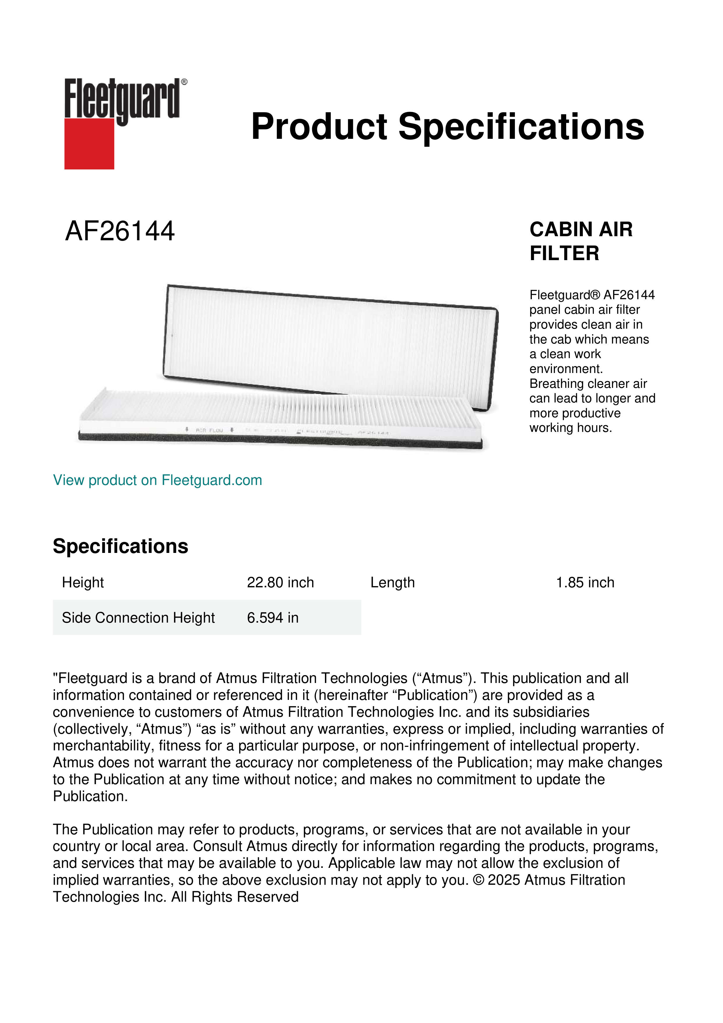 Fleetguard® AF26144 panel cabin air filter provides clean air in the cab which means a clean work environment. Breathing cleaner air can lead to longer and more productive working hours.Specification