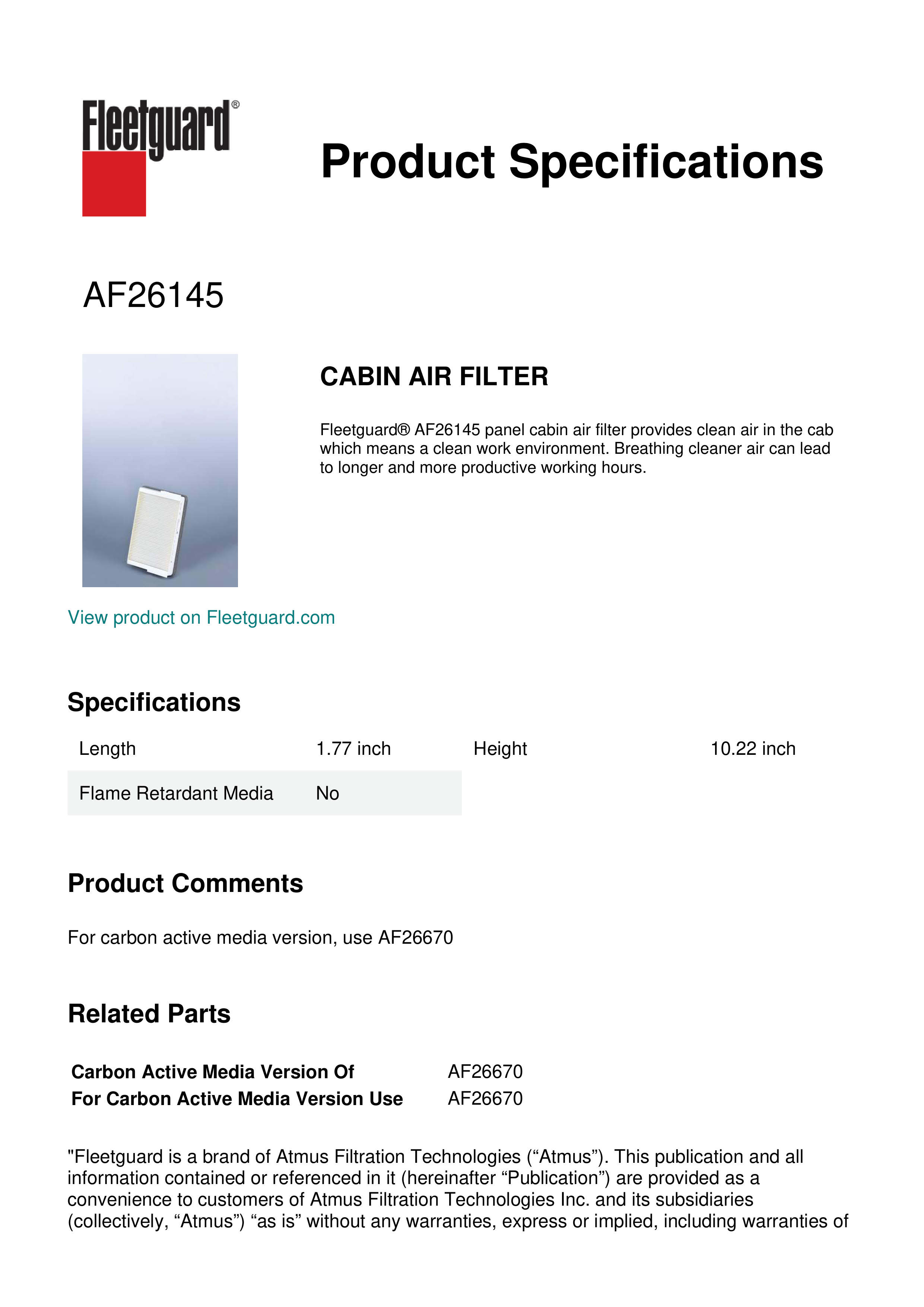 Fleetguard® AF26145 panel cabin air filter provides clean air in the cab which means a clean work environment. Breathing cleaner air can lead to longer and more productive working hours.Specification