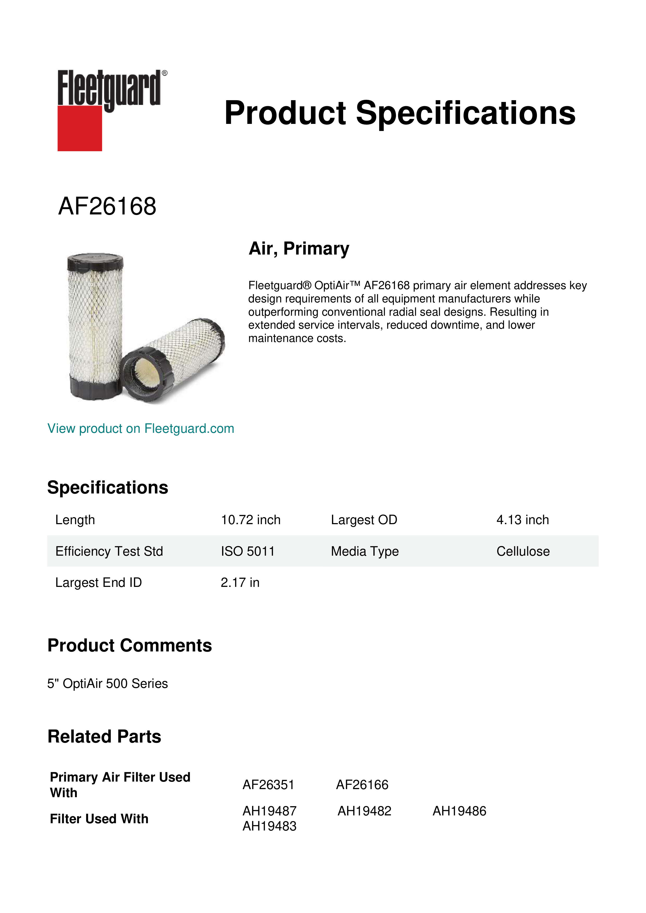 Fleetguard® OptiAir™ AF26168 primary air element addresses key design requirements of all equipment manufacturers while outperforming conventional radial seal designs. Resulting in extended service intervals, reduced downtime, and lower maintenance costs.Specification