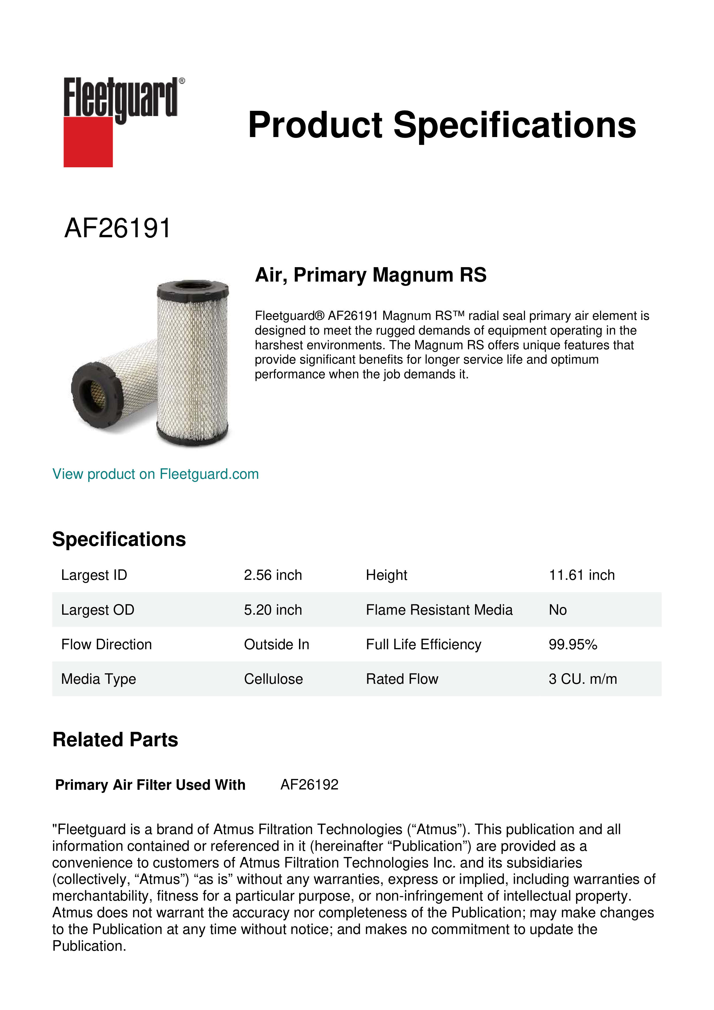 Fleetguard® AF26191 Magnum RS™ radial seal primary air element is designed to meet the rugged demands of equipment operating in the harshest environments. The Magnum RS offers unique features that provide significant benefits for longer service life and optimum performance when the job demands it.Specification