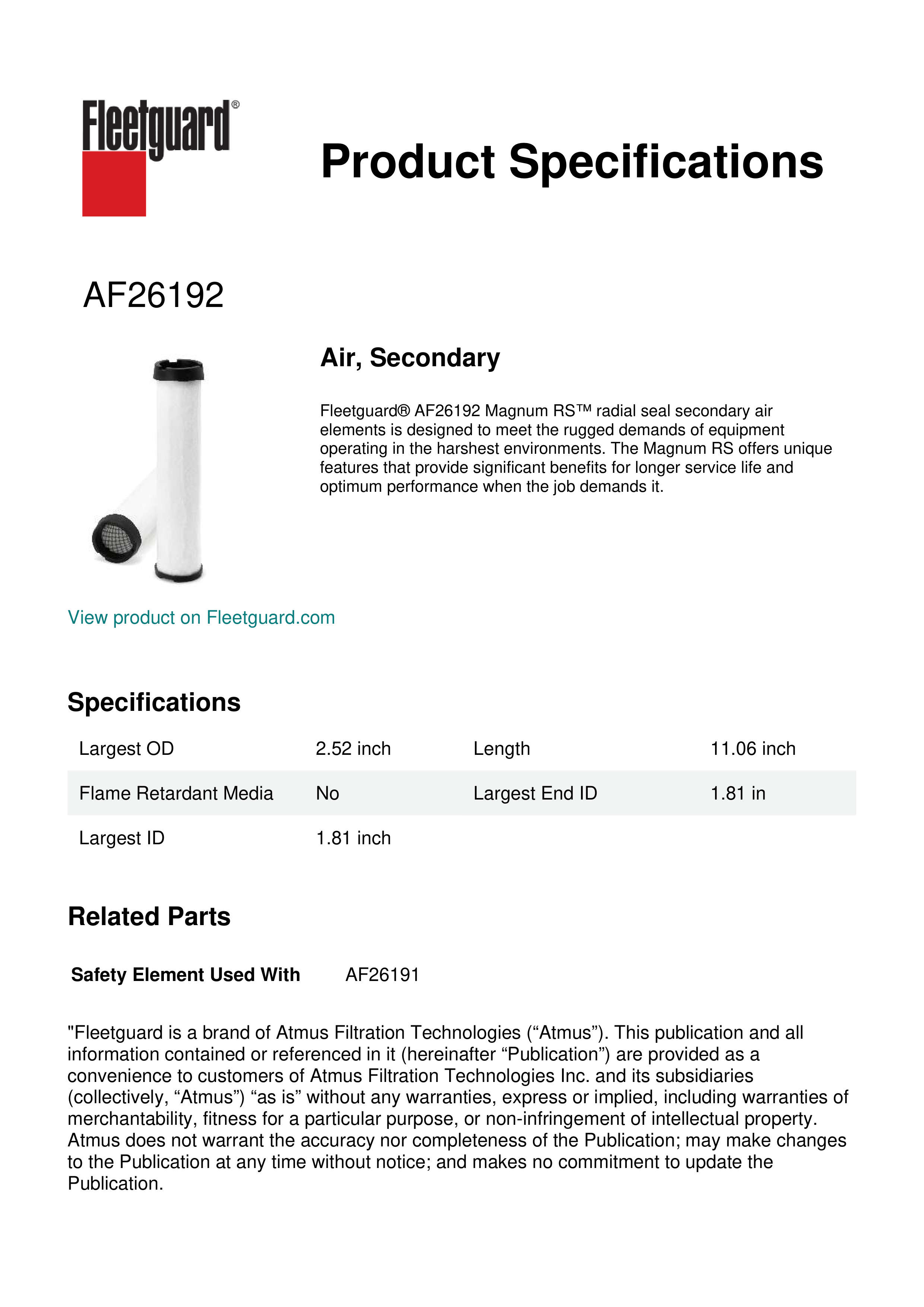 Fleetguard® AF26192 Magnum RS™ radial seal secondary air elements is designed to meet the rugged demands of equipment operating in the harshest environments. The Magnum RS offers unique features that provide significant benefits for longer service life and optimum performance when the job demands it.Specification