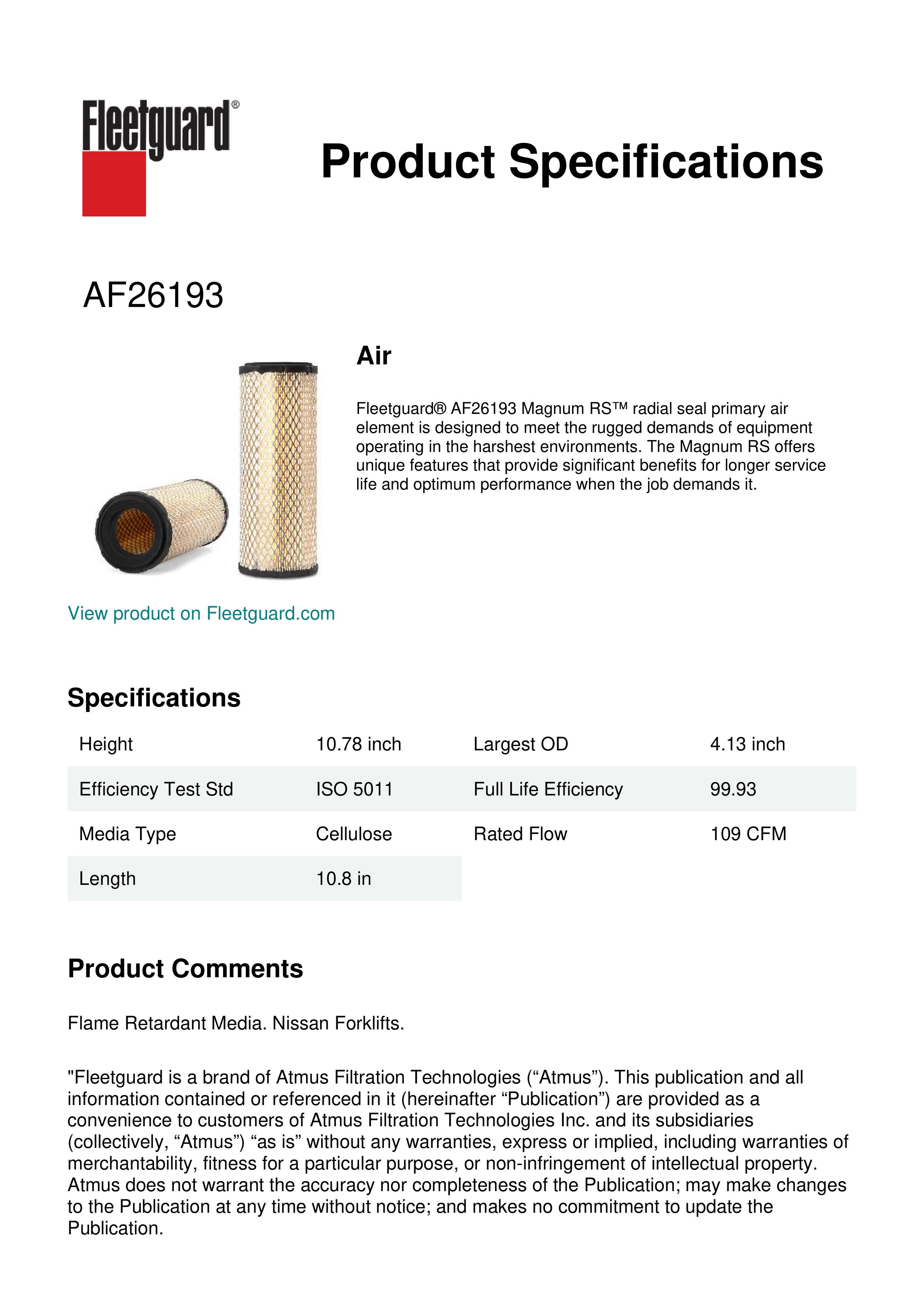 Fleetguard® AF26193 Magnum RS™ radial seal primary air element is designed to meet the rugged demands of equipment operating in the harshest environments. The Magnum RS offers unique features that provide significant benefits for longer service life and optimum performance when the job demands it.Specification