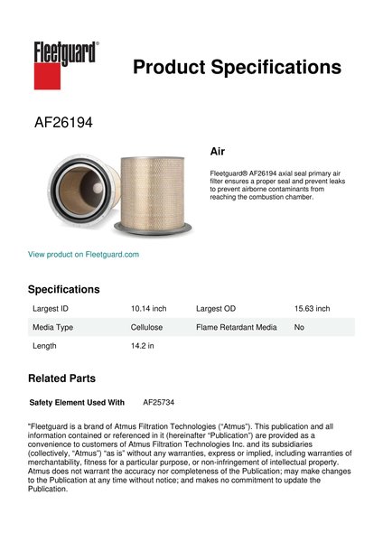 Fleetguard® AF26194 axial seal primary air filter ensures a proper seal and prevent leaks to prevent airborne contaminants from reaching the combustion chamber.
