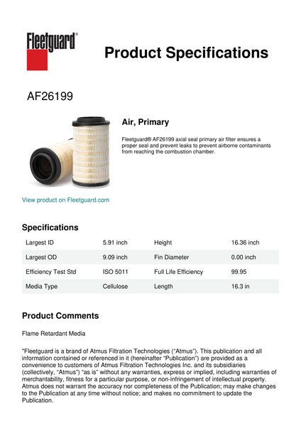 Fleetguard® AF26199 axial seal primary air filter ensures a proper seal and prevent leaks to prevent airborne contaminants from reaching the combustion chamber.Specification