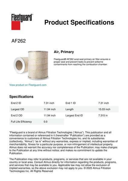 Fleetguard® AF262 axial seal primary air filter ensures a proper seal and prevent leaks to prevent airborne contaminants from reaching the combustion chamber.Specification