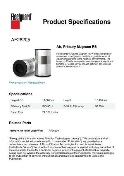 Fleetguard® AF26205 Magnum RS™ radial seal primary air element is designed to meet the rugged demands of equipment operating in the harshest environments. The Magnum RS offers unique features that provide significant benefits for longer service life and optimum performance when the job demands it.Specification