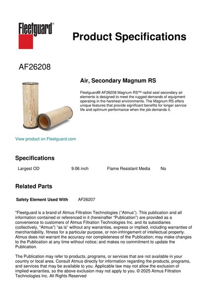 Fleetguard® AF26208 Magnum RS™ radial seal secondary air elements is designed to meet the rugged demands of equipment operating in the harshest environments. The Magnum RS offers unique features that provide significant benefits for longer service life and optimum performance when the job demands it.Specification