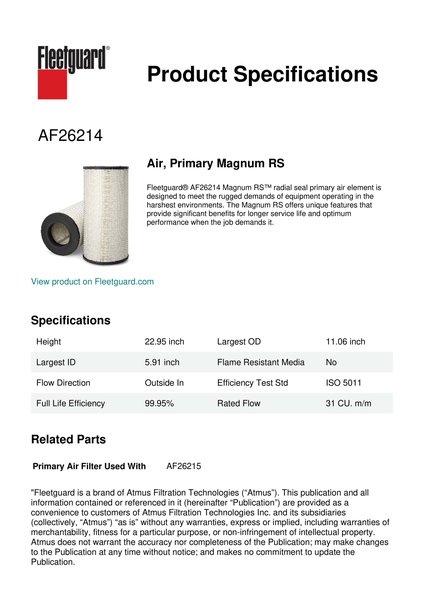 Fleetguard® AF26214 Magnum RS™ radial seal primary air element is designed to meet the rugged demands of equipment operating in the harshest environments. The Magnum RS offers unique features that provide significant benefits for longer service life and optimum performance when the job demands it.Specification