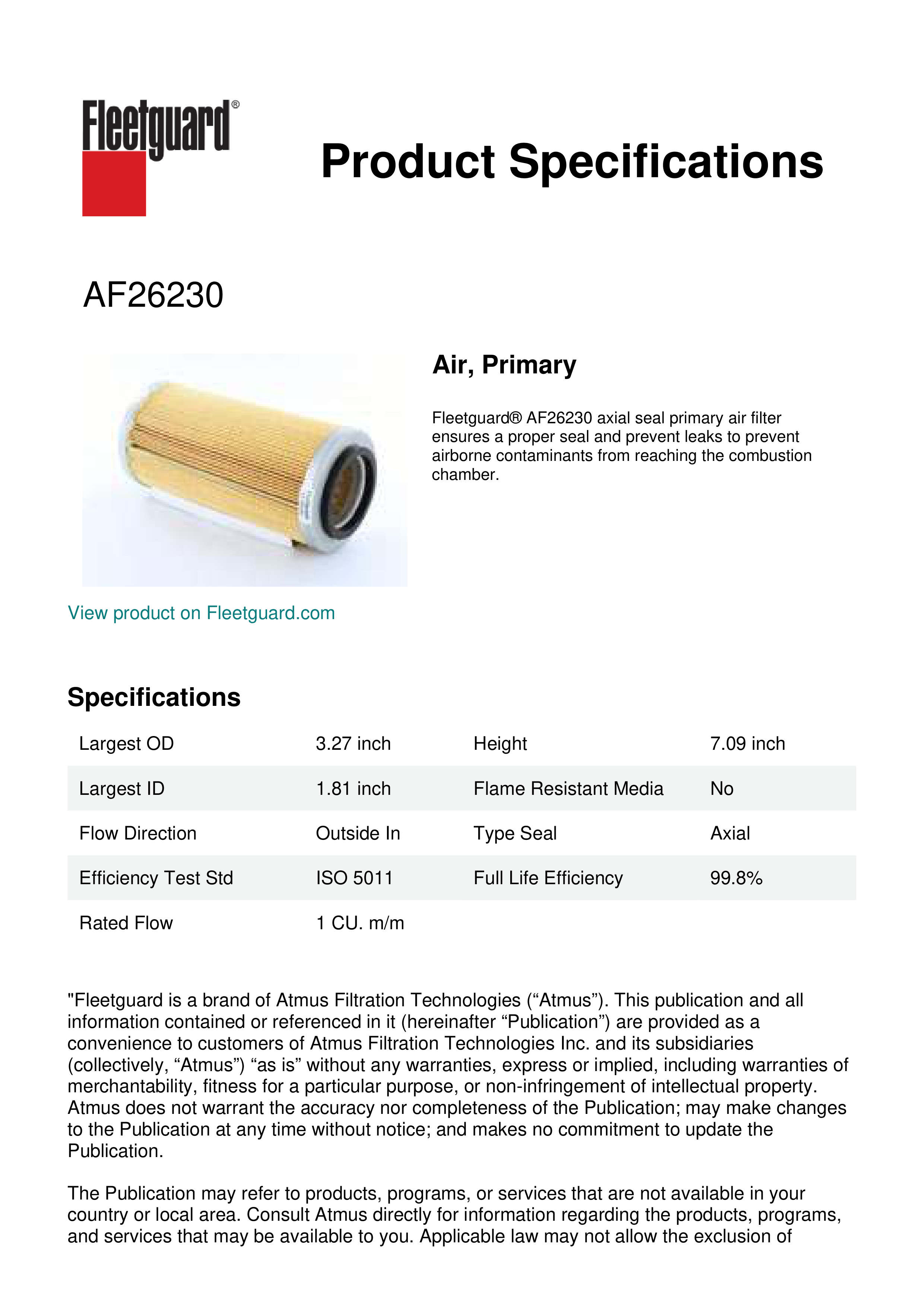 Fleetguard® AF26230 axial seal primary air filter ensures a proper seal and prevent leaks to prevent airborne contaminants from reaching the combustion chamber.