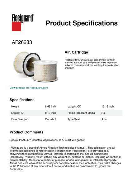 Fleetguard® AF26233 axial seal primary air filter ensures a proper seal and prevent leaks to prevent airborne contaminants from reaching the combustion chamber.