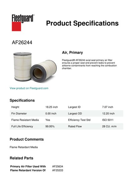 Fleetguard® AF26244 axial seal primary air filter ensures a proper seal and prevent leaks to prevent airborne contaminants from reaching the combustion chamber.