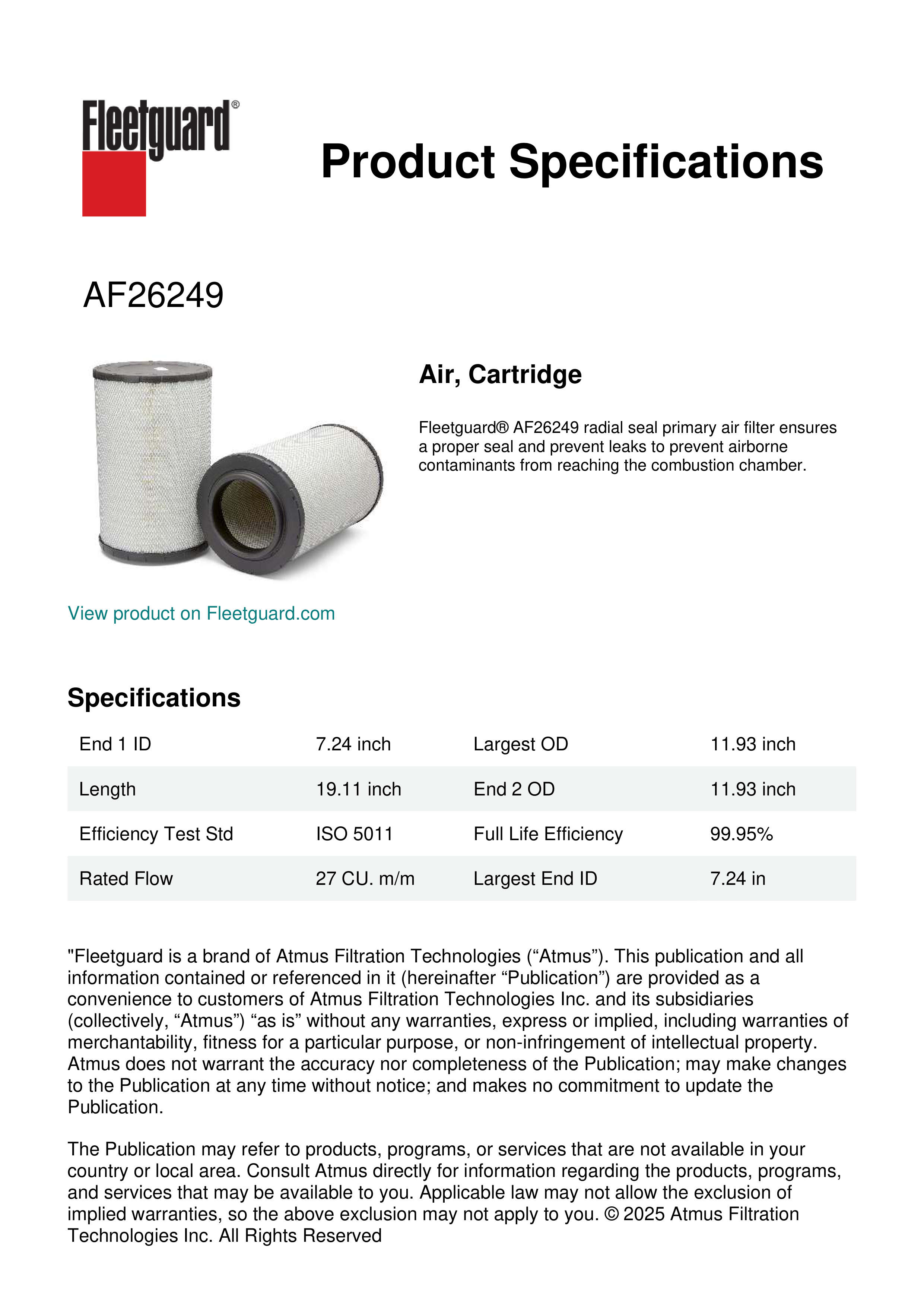 Fleetguard® AF26249 radial seal primary air filter ensures a proper seal and prevent leaks to prevent airborne contaminants from reaching the combustion chamber.Specification