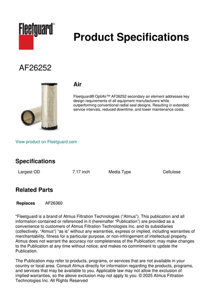 Fleetguard® OptiAir™ AF26252 secondary air element addresses key design requirements of all equipment manufacturers while outperforming conventional radial seal designs. Resulting in extended service intervals, reduced downtime, and lower maintenance costs.Specification