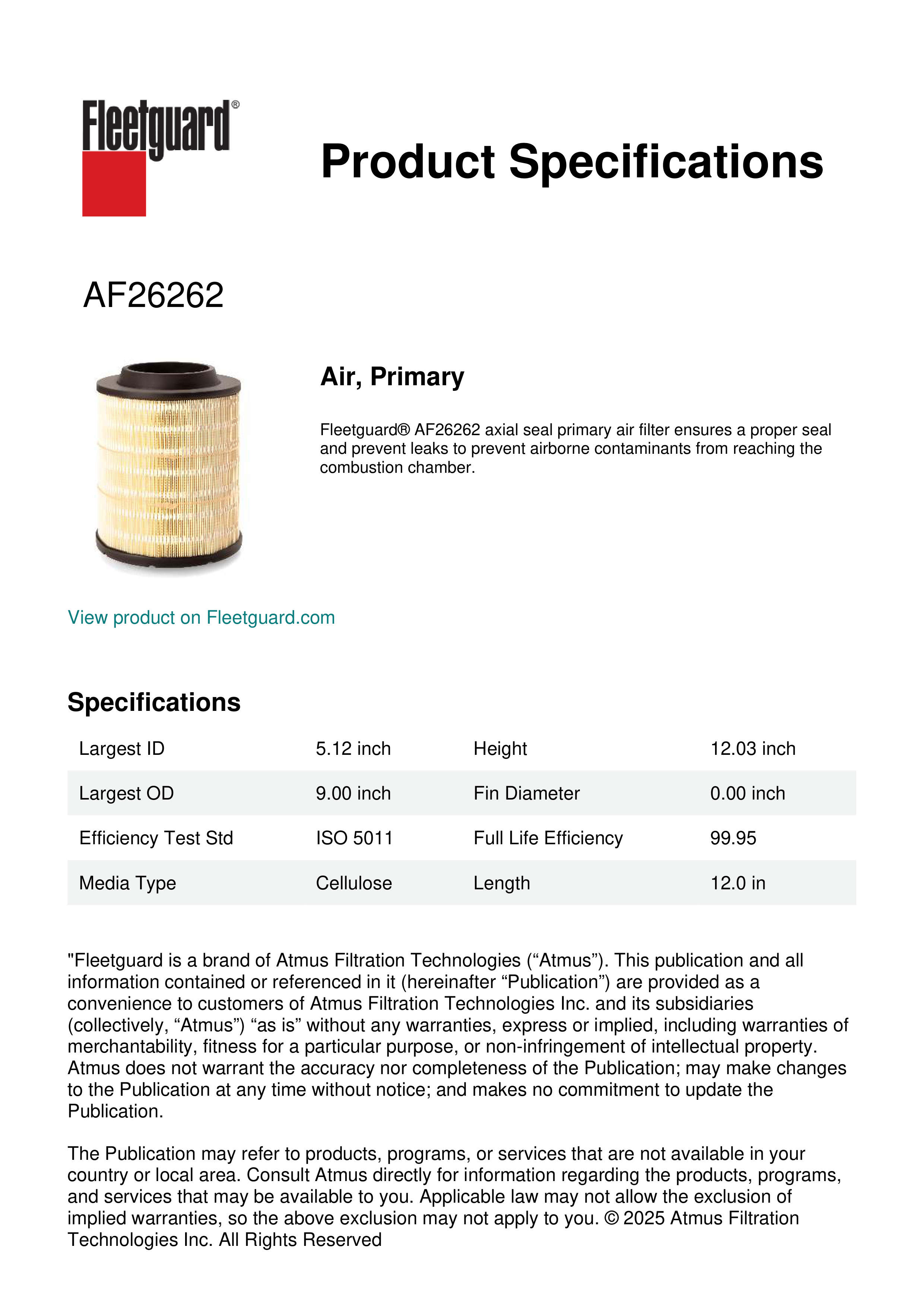 Fleetguard® AF26262 axial seal primary air filter ensures a proper seal and prevent leaks to prevent airborne contaminants from reaching the combustion chamber.