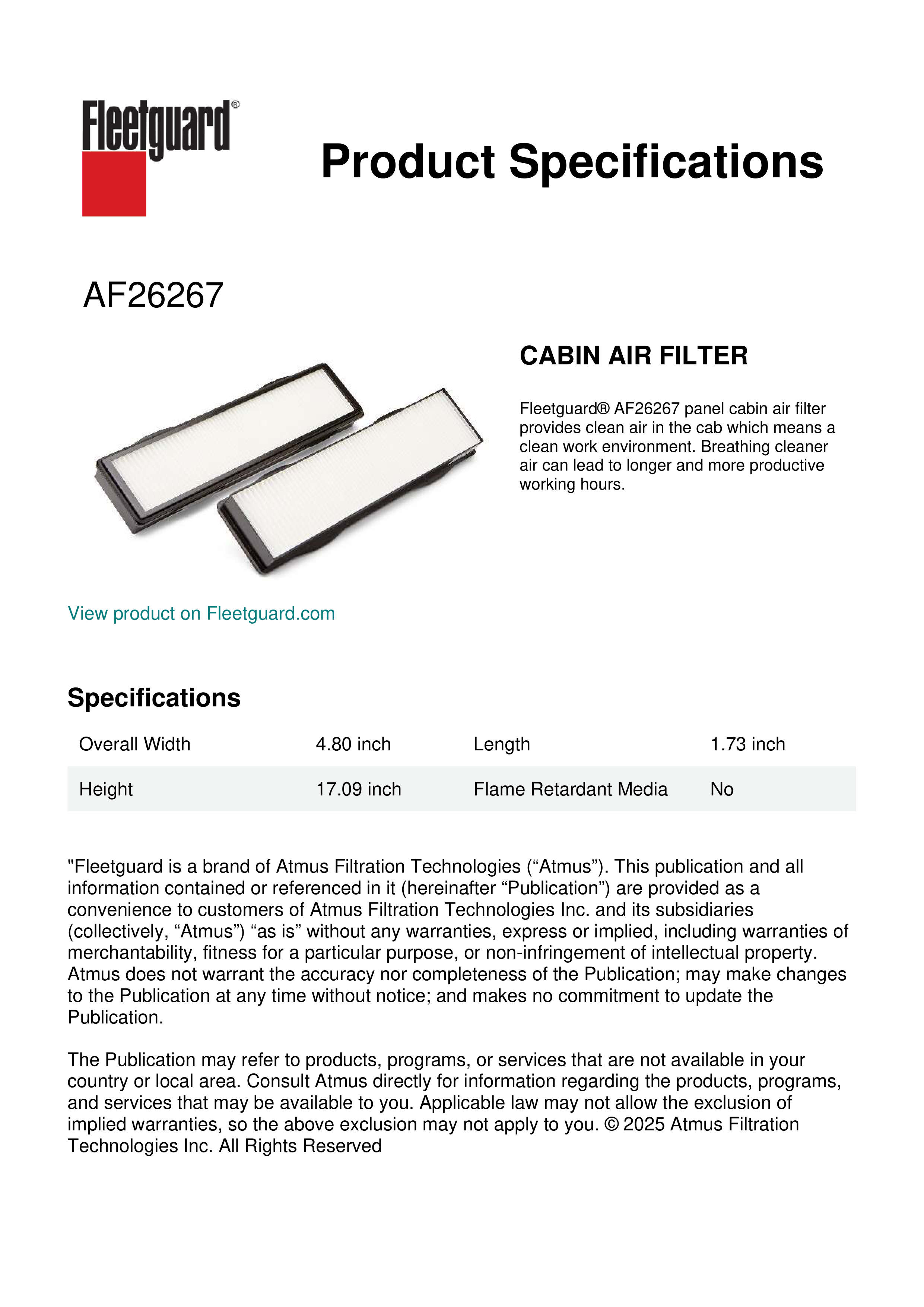 Fleetguard® AF26267 panel cabin air filter provides clean air in the cab which means a clean work environment. Breathing cleaner air can lead to longer and more productive working hours.Specification