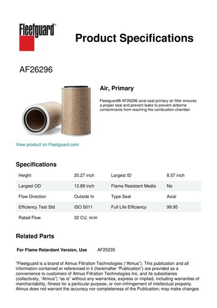 Fleetguard® AF26296 axial seal primary air filter ensures a proper seal and prevent leaks to prevent airborne contaminants from reaching the combustion chamber.