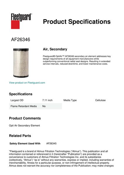 Fleetguard® OptiAir™ AF26346 secondary air element addresses key design requirements of all equipment manufacturers while outperforming conventional radial seal designs. Resulting in extended service intervals, reduced downtime, and lower maintenance costs.Specification
