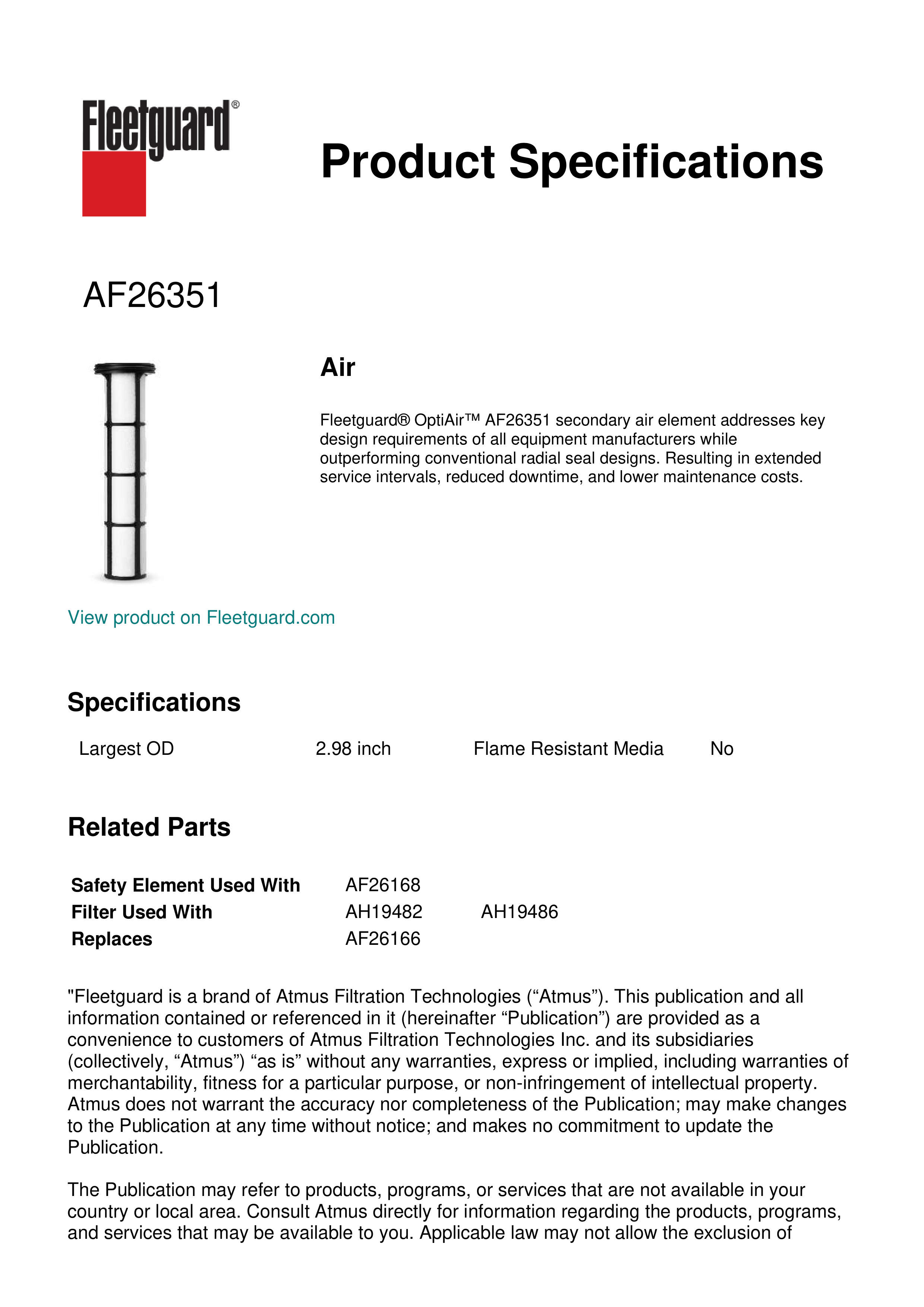 Fleetguard® OptiAir™ AF26351 secondary air element addresses key design requirements of all equipment manufacturers while outperforming conventional radial seal designs. Resulting in extended service intervals, reduced downtime, and lower maintenance costs.Specification