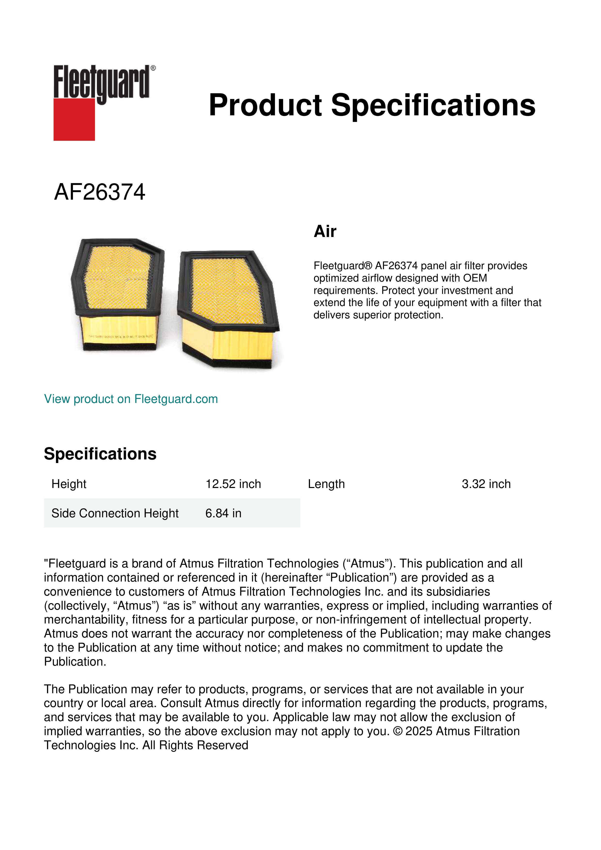 Fleetguard® AF26374 panel air filter provides optimized airflow designed with OEM requirements. Protect your investment and extend the life of your equipment with a filter that delivers superior protection.Specification