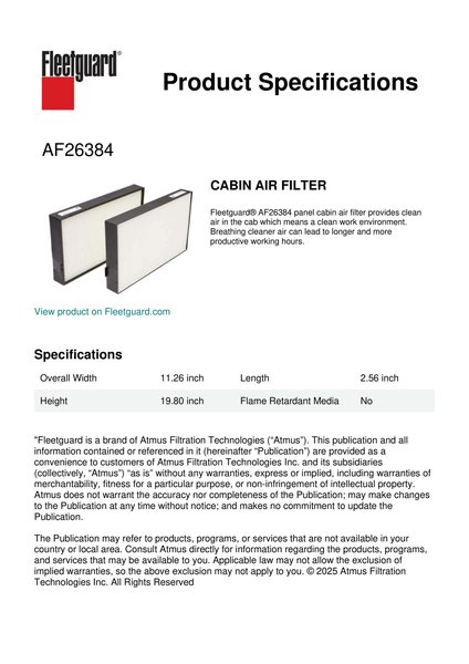 Fleetguard® AF26384 panel cabin air filter provides clean air in the cab which means a clean work environment. Breathing cleaner air can lead to longer and more productive working hours.Specification