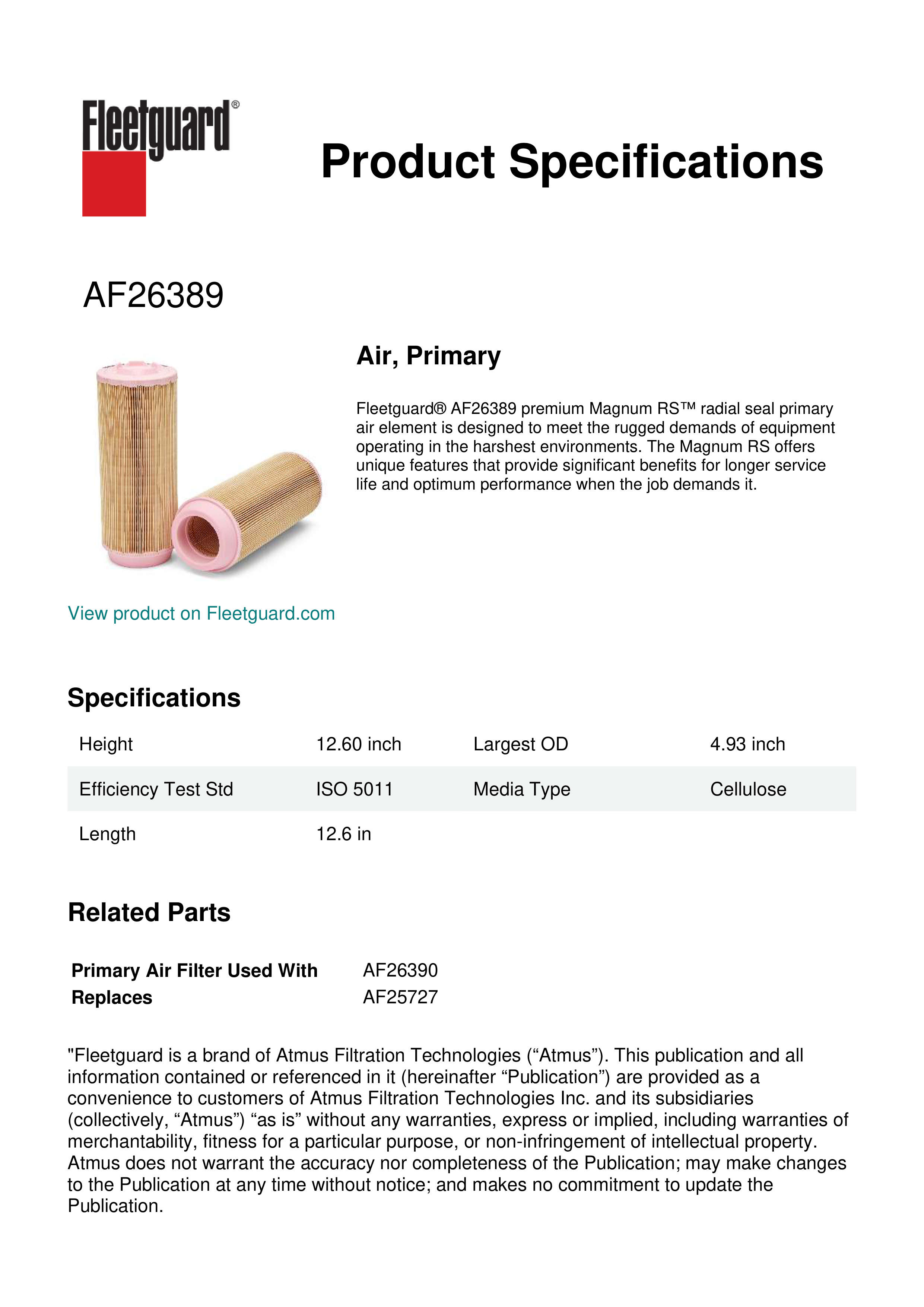 Fleetguard® AF26389 premium Magnum RS™ radial seal primary air element is designed to meet the rugged demands of equipment operating in the harshest environments. The Magnum RS offers unique features that provide significant benefits for longer service life and optimum performance when the job demands it.